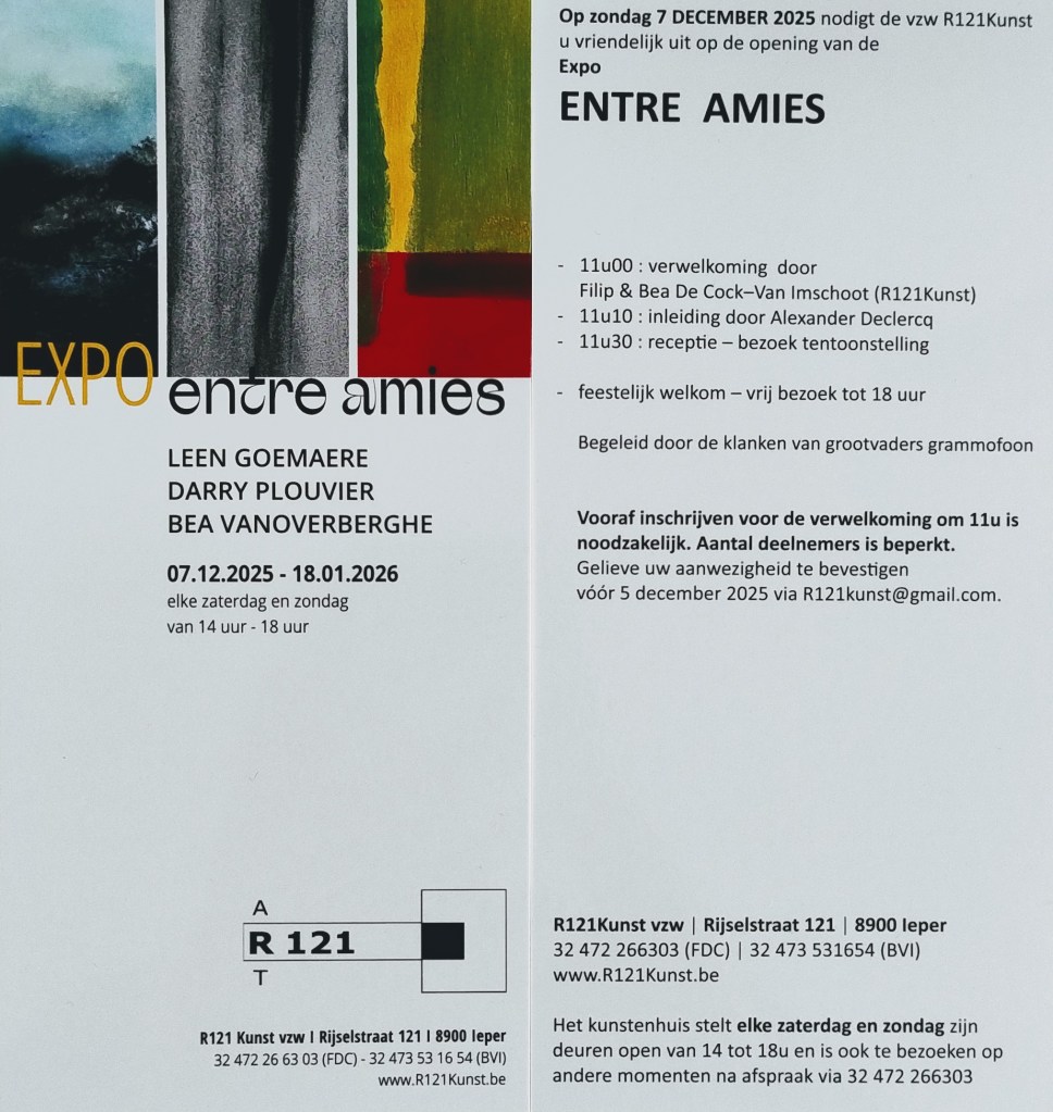 “Entre Amies” is een titel voor het werk van drie vrouwen. Bea Vanoverberghe, Darry Plouvier en Leen Goemaere zijn sinds lang met elkaar verbonden door vriendschap en de liefde voor de kunst. Onbewust brengen zij met hun authentiek werk een ode aan de vele mensen in onze samenleving die  hun talenten tot ontwikkeling brengen. Kunstenaars zijn belangrijk. Vrouwelijke kunstenaars zeker. “Les amies” nodigen ons uit op een reis naar een land waar, zoals Charles Beaudelaire het schrijft: “Là, tout n’est qu’ordre et beauté, luxe, calme et volupté.“