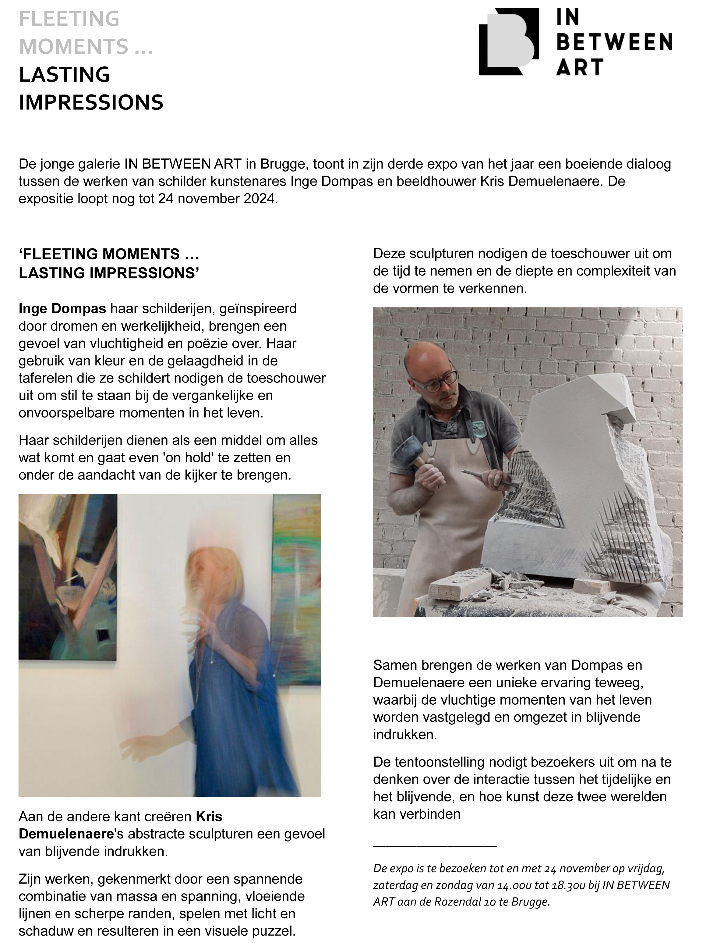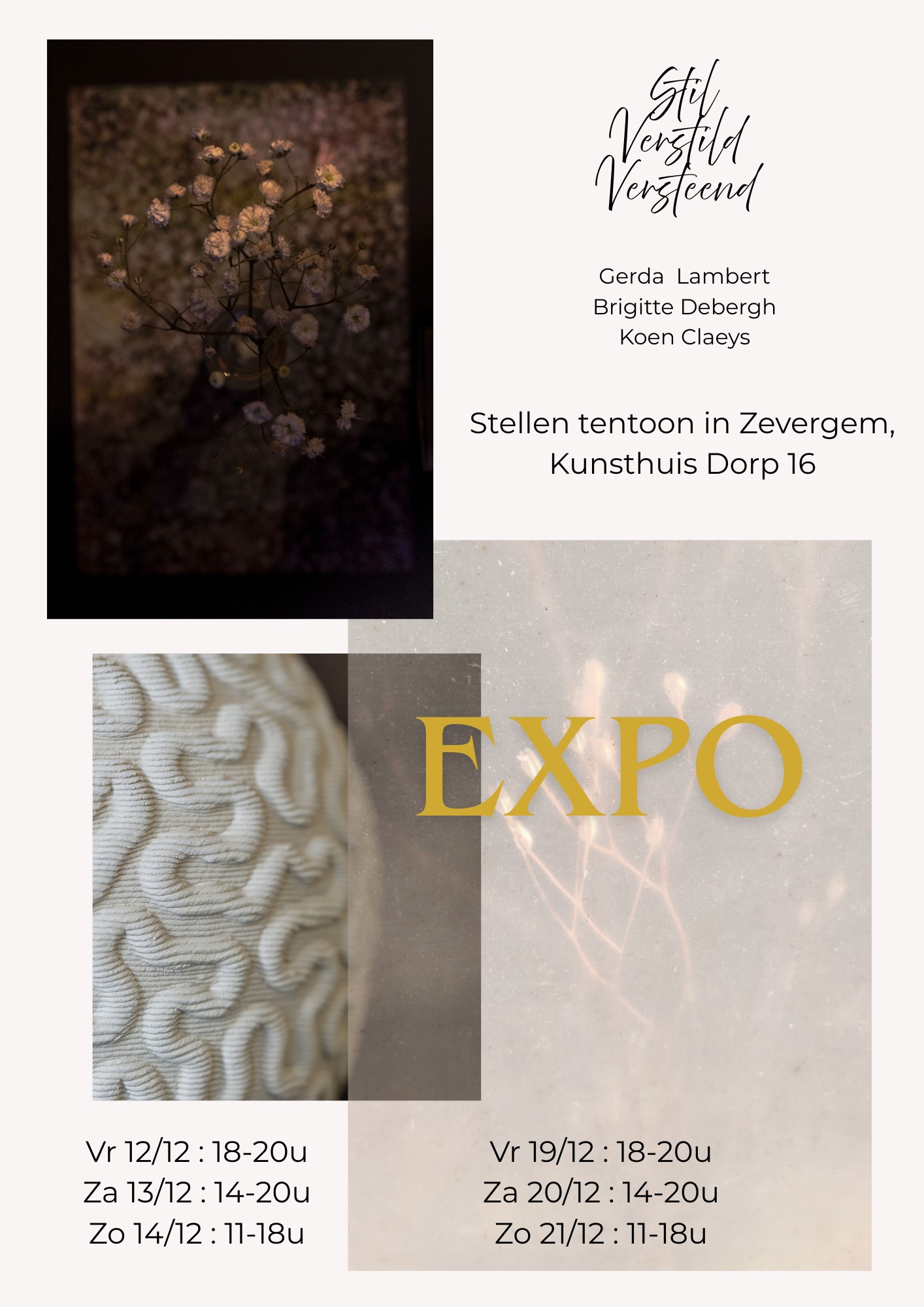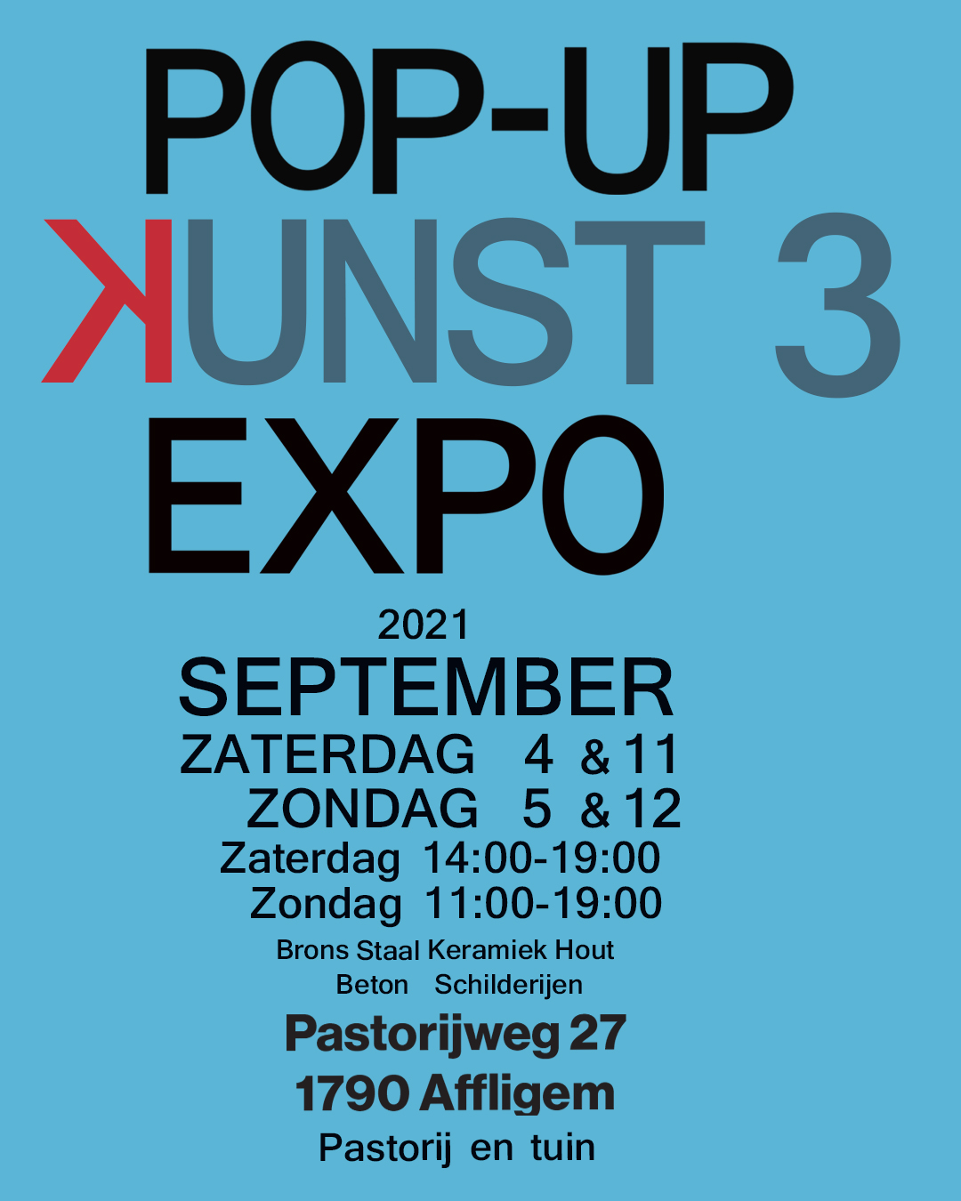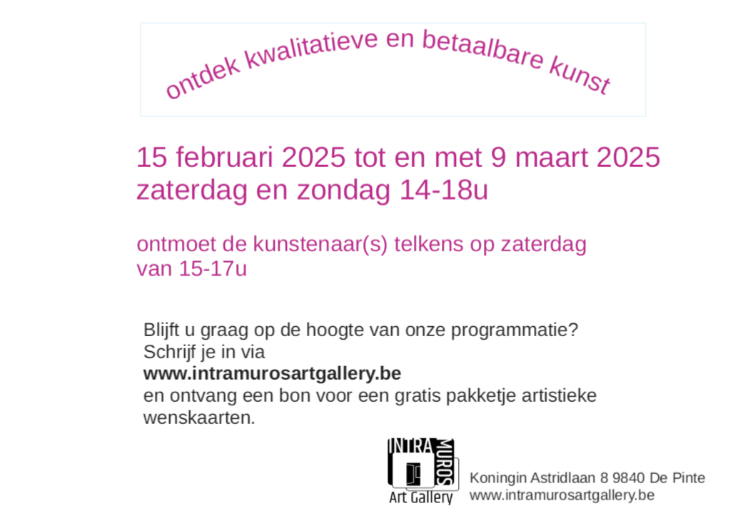 Deze tentoonstelling is elk weekend van 5 september en 18 oktober open.  De uren zijn van 14u tot 17u.  Het adres is: A. Rodenbachstraat 18 te 3500 Hasselt
