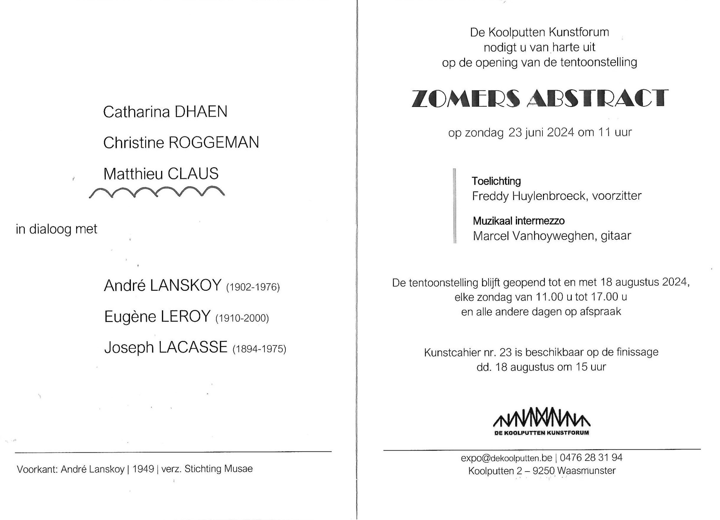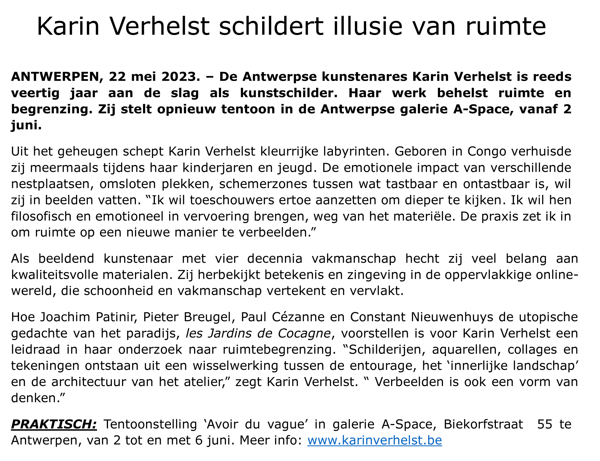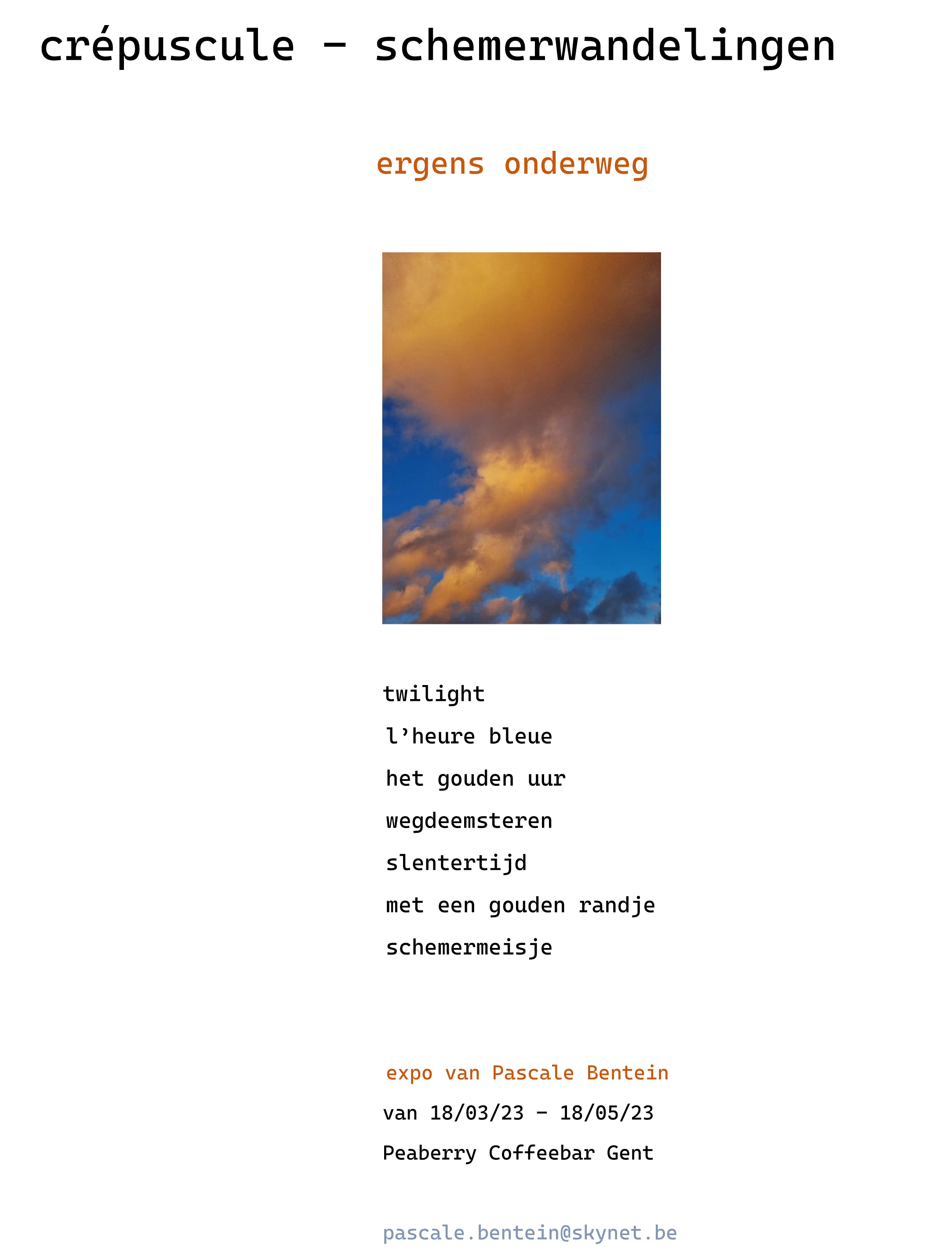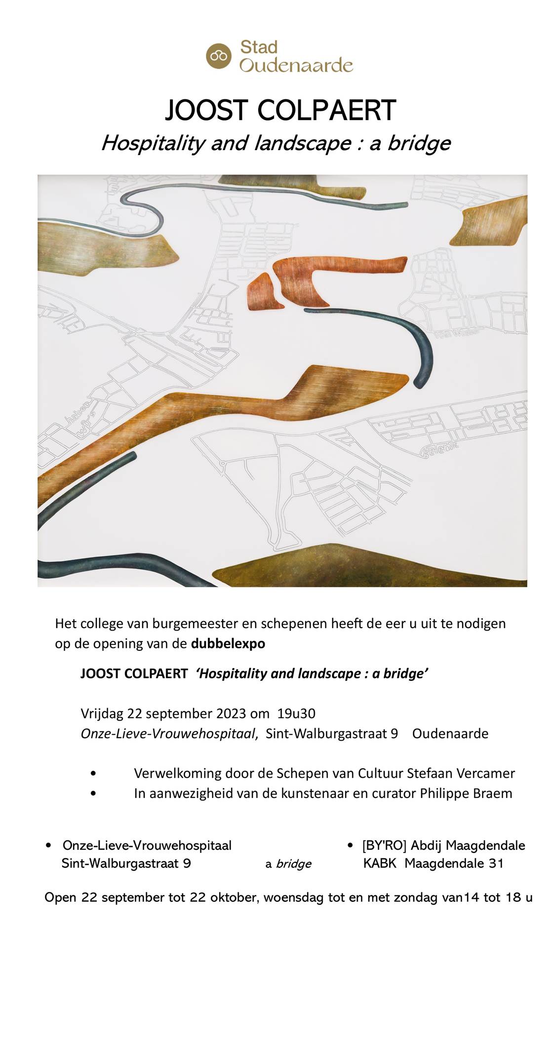 Deze tentoonstelling is elk weekend van 5 september en 18 oktober open.  De uren zijn van 14u tot 17u.  Het adres is: A. Rodenbachstraat 18 te 3500 Hasselt