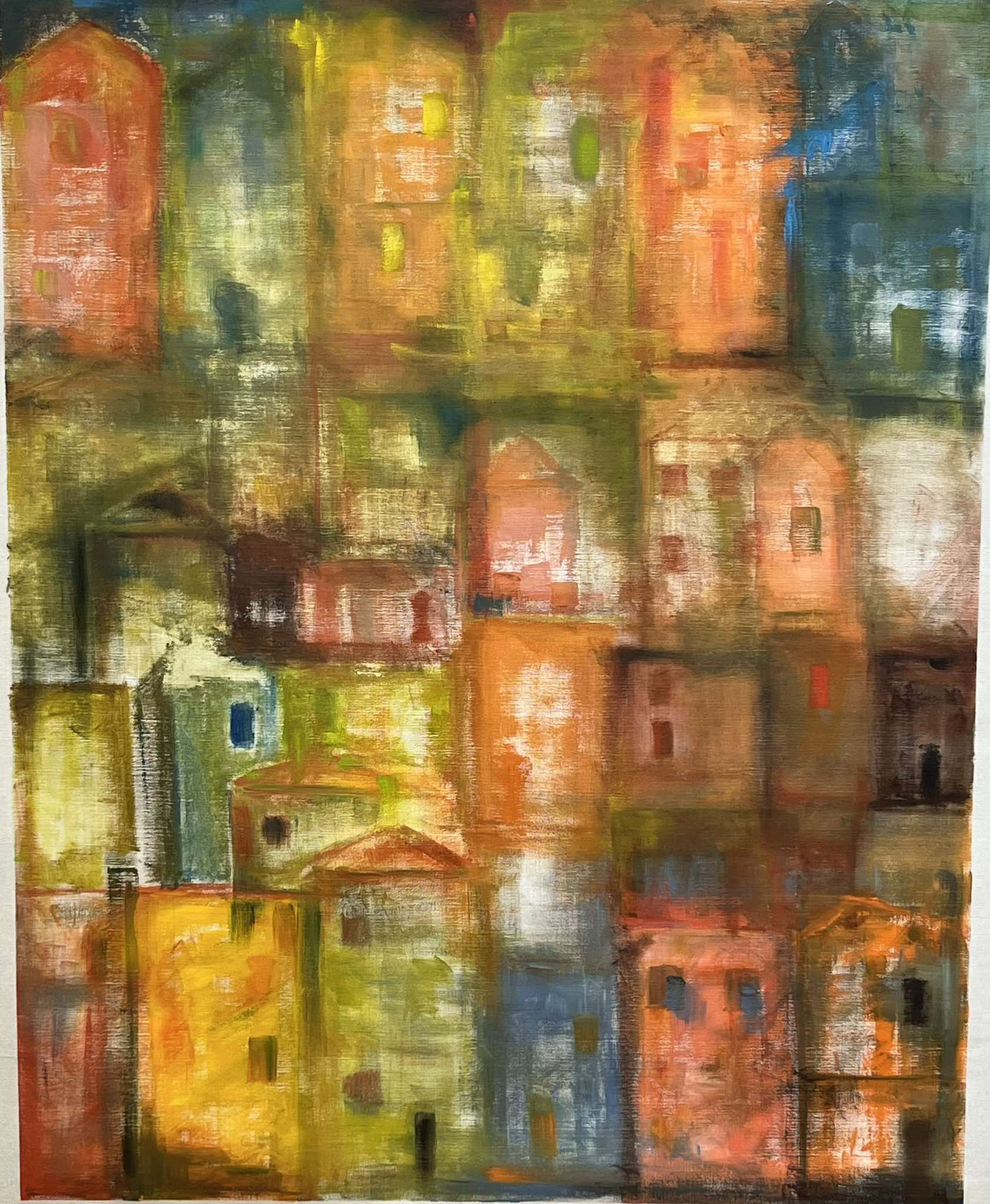 Bea Vanoverberghe geeft de wereld weer in abstracte lijnen en vormen. Voor haar schilderwerk gebruikt Bea Vanoverberghe canvas en acryl. Haar kleurenpalet is warm en zacht: geel, groen, oranje, oker, groene en bruine tinten. Aardekleuren. Uitzonderlijk vinden we een streepje blauw terug.